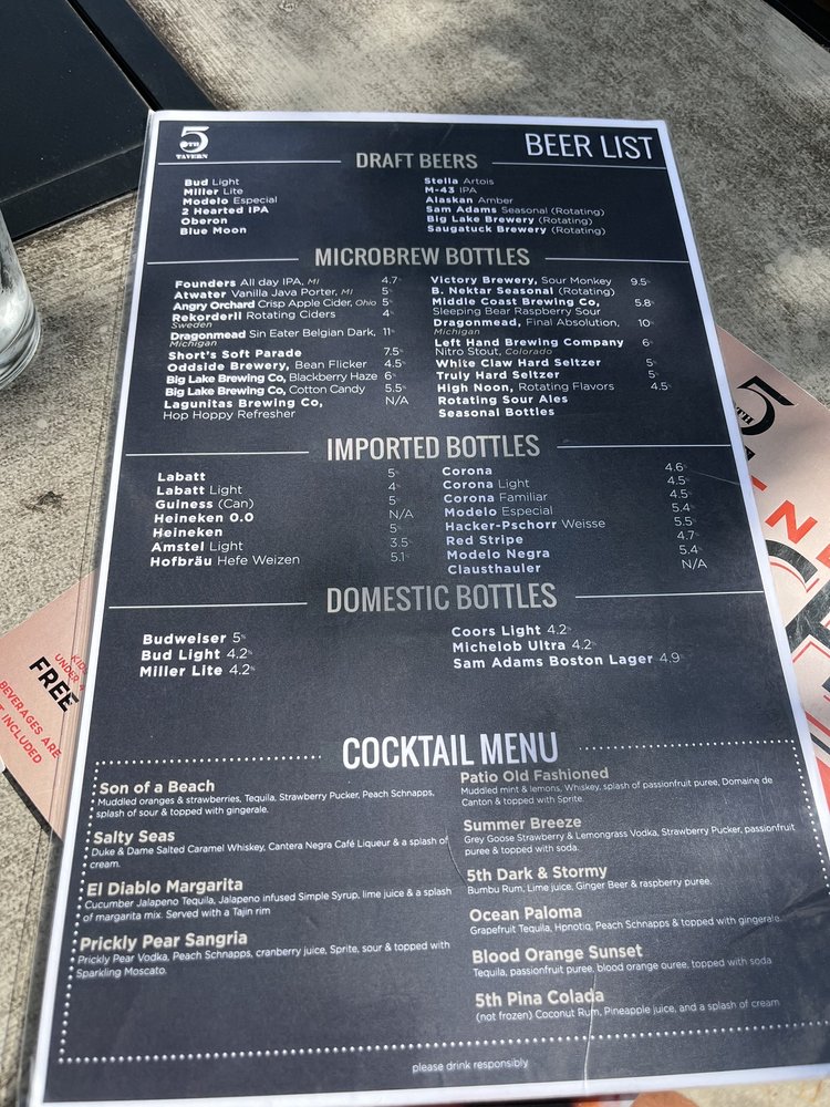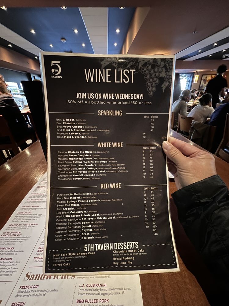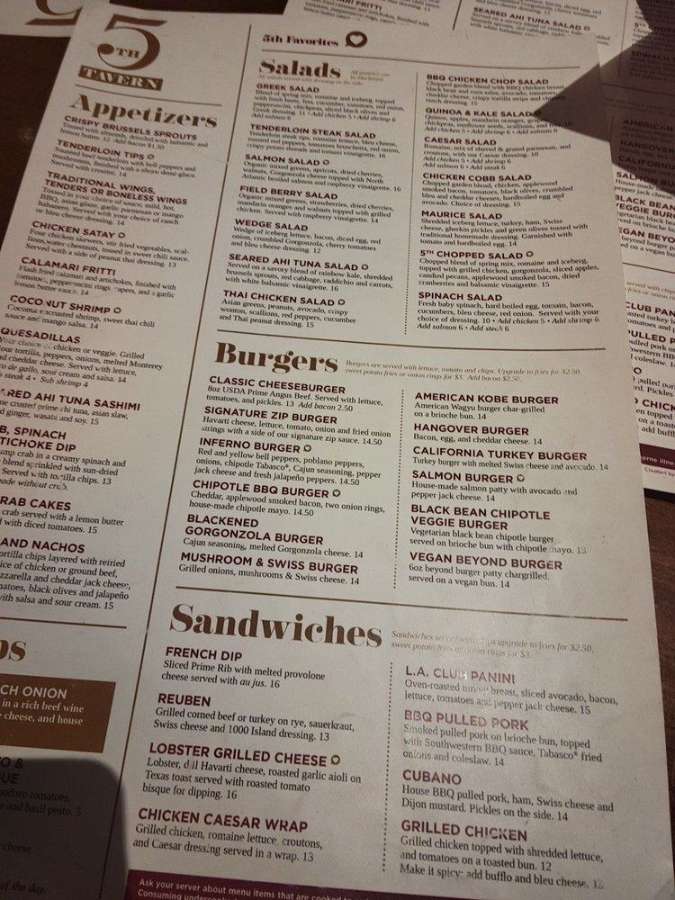 Located in Bloomfield Hills, MI, 5th Tavern offers a diverse menu of New American cuisine in a classy yet casual setting. The restaurant provides a range of amenities such as outdoor seating, waitstaff service, and a full bar. The menu features delicious salads like the 5th Chopped Salad and BBQ Chicken Chop Salad, along with savory soups like Baked French Onion and Roasted Tomato & Asparagus Bisque. Appetizers like Boneless Wings and Calamari Fritti are perfect for sharing or as a starter. Customers have praised the fresh and delicious food, friendly staff, and accommodating service. While some reviews mention minor issues like saltiness in dishes or limited vegan options, overall, 5th Tavern is highly recommended for a pleasant dining experience with quality food. Visit 5th Tavern for a memorable meal with family and friends.